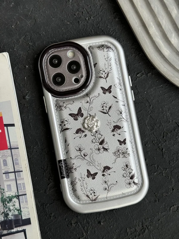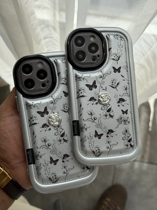 قاب گوشی آیفون پروانه و گل ریز نقره ای