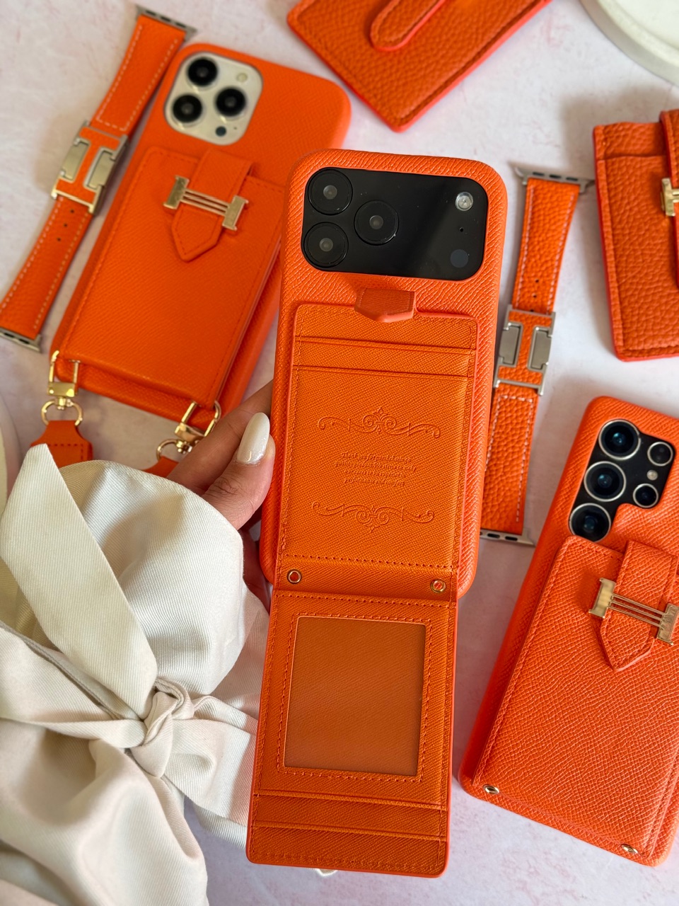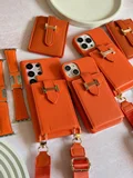 قاب آیفون هرمس کیفی چرمی با بند بلند رنگ نارنجی